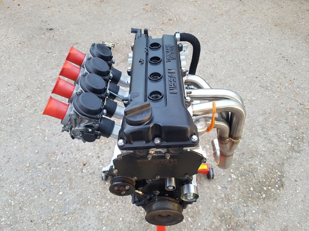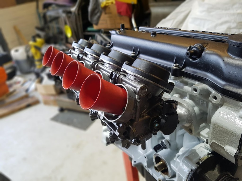 4x 36mm Mikuni carburettors mounted on a fabricated aluminium intake manifold. Stripped, ultrasonically cleaned and rebuilt in-house with jets and needles to suit the Nissan CG engine.